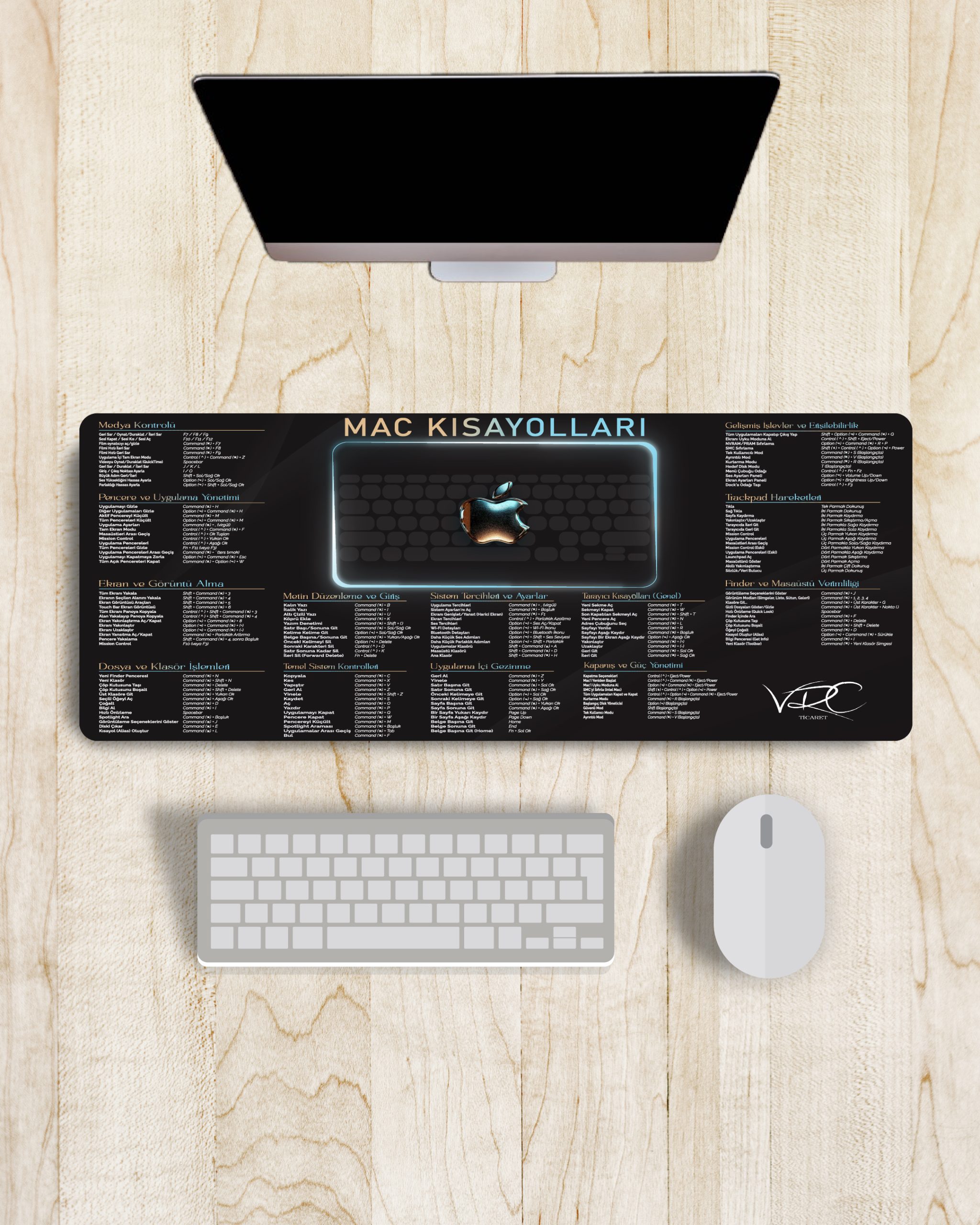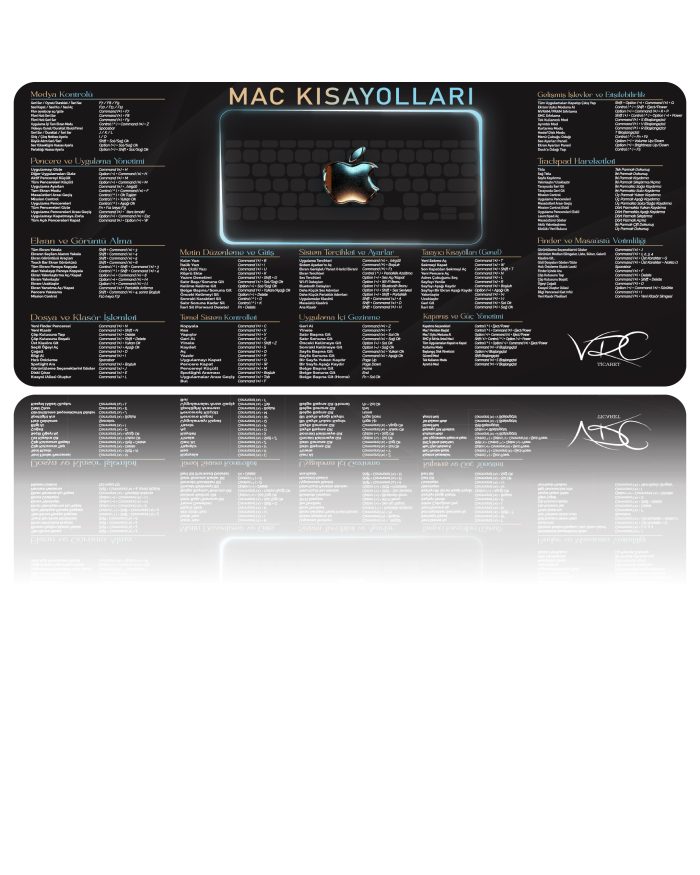 Sık kullanılan tüm macOS kısayolları, mousepad üzerinde kategorilere ayrılarak yerleştirilmiştir.